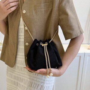 Black Fashionable Women's Chain & Faux Pearl Decor Bucket Bag Polyester