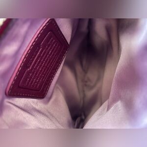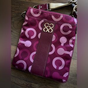 Vibrant magenta crossbody with classic Coach pattern.