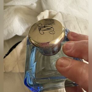 Elegant fragrance in a blue bottle. Features a gold cap with engraved initials.