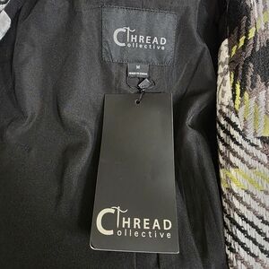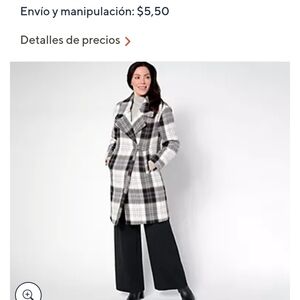 Stylish plaid coat. Features black, white, and gray tones. Perfect for cool weather.