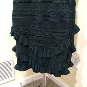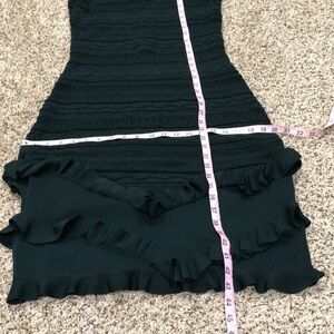 Elegant black dress with intricate lace detailing. Sleeveless design. Ruffled hem adds flair.