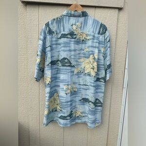 The product is a vintage Tommy Bahama Hawaiian shirt in size XL, made of a cotton and rayon blend with a light blue floral pattern. It features a relaxed fit with a button closure and short sleeves, perfect for summer and spring seasons. The shirt has a Hawaiian theme and Aloha style, ideal for men looking for a casual yet stylish button-up shirt for their wardrobe. Excellent condition. See photos