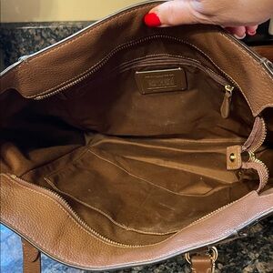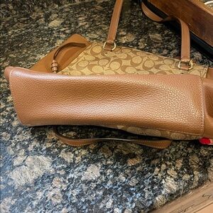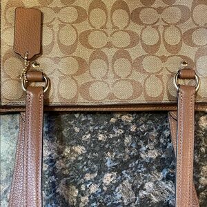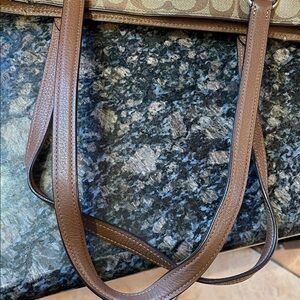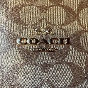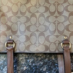 Stylish Coach tote with signature pattern. Features tan and brown hues. Perfect for daily use. Cute outside pockets in front. Zippered pocket inside and 2 open pockets on opposite side. Excellent condition. Worth measures approximately 16 inches across and height measures approximately 12 inches.