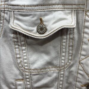 Stylish off-white denim jacket. Features classic button-up design. Ideal for casual wear.