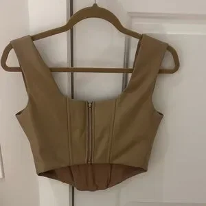 This elegant tan sleeveless top is perfect for any occasion. Its sleek design offers a flattering fit, making it a versatile addition to your wardrobe.