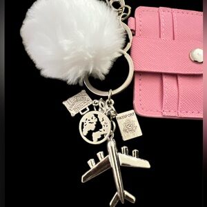 Stylish pink faux leather card holder customized with a fluffy keychain and airplane and passport accessories keychain. Perfect for keeping your essentials organized and accessible.