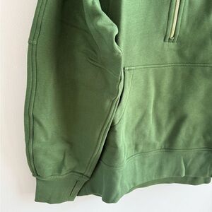 Oversized and cozy Lululemon quarter zip pull over in a pretty green color with gold zipper detail. Logo on back. Perfect versatile pull over that can be dressed up or down!
