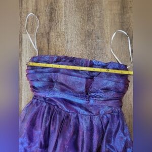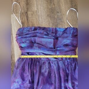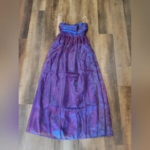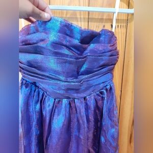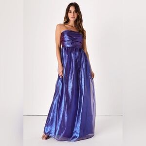 Elegant strapless gown in a shimmering purple hue. Perfect for formal occasions.