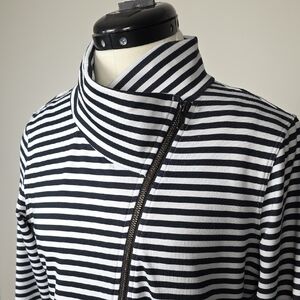 Lolë striped jacket, Lolë zip up jacket, navy white stripe sweater, Lolë activewear Canada, asymmetrical zipper jacket, high neck Lolë top, funnel neck Lolë jacket, stretchy athletic jacket, casual chic Lolë outerwear, Canadian activewear brand, Lolë pre-loved, minimalistic sport style, yoga jacket Lolë, travel jacket women, comfortable softshell Lolë