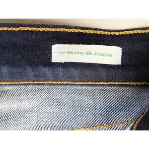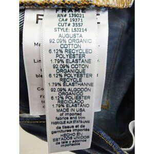 The Frame 29X31 Women's Le Skinny De Jeanne Augusta Blue Denim Embroidered Logo Jeans are a stylish and trendy addition to any woman's wardrobe. Made from a blend of polyester, spandex, and cotton, these jeans feature a mid-rise fit and a 5-pocket design, with the iconic embroidered logo adding a touch of sophistication. The dark wash denim adds a classic touch, while the skinny style flatters the figure. Perfect for any season, these jeans offer both comfort and style for the fashion-forward woman.