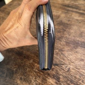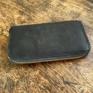 Elegant black leather wallet. Features iconic Tory Burch logo. Gold zipper accent.