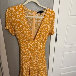 Chic mustard dress with floral pattern. Features short sleeves and a flattering fit. Ideal for any occasion.