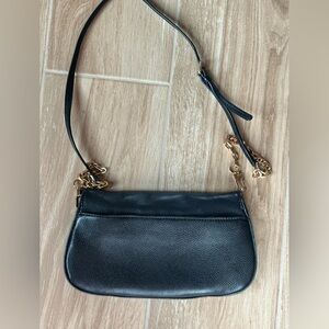 with gold logo and hardware. Features an optional chain-woven strap that offers hands-free versatility.