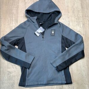 Stylish Spyder jacket with a hood. Features a half-zip front. Comfortable and sleek design.