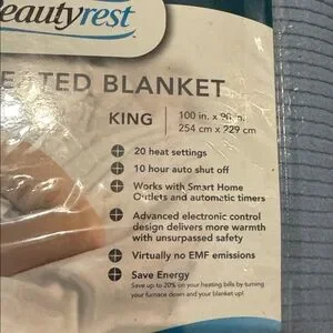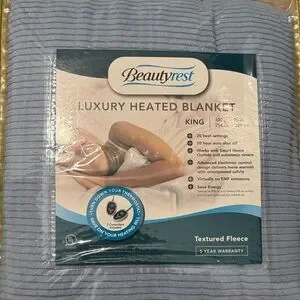 Luxury heated blanket by Beautyrest. Soft blue color. King size with 20 heat settings. See photo for stats. Textured blue fleece.