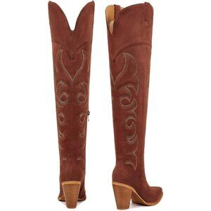 Women Over Knee Reddish Faux Leather Pull On Tab Chunky Heel Pointed Toe Boots