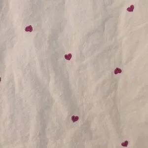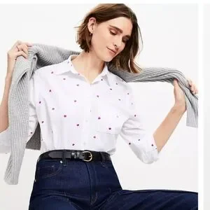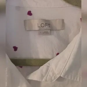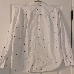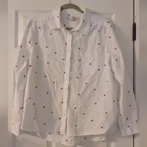 Chic white button-down with pink heart patterns. Perfect for versatile styling. In excellent condition, worn once. Ships from a smoke free home.