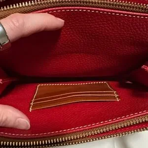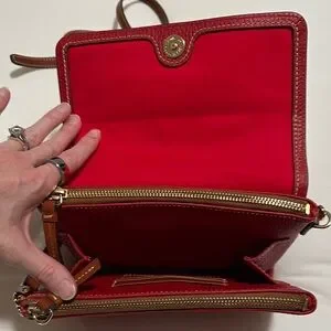 Stylish red crossbody bag with brown strap. Perfect for any occasion. Crafted by Dooney & Bourke.