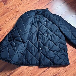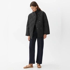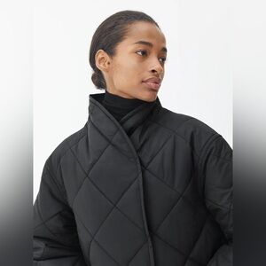 Styled with a standing shawl collar and hidden double breast buttoning, this quilted jacket is cut for an oversized fit. With a shell and lining made from recycled polyamide and padding made of recycled polyester, the jacket offers water repellent and insulating properties. Pocket at side seams and snap button closure at front.