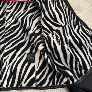 Stylish faux black leather jacket featuring a bold fabric zebra print lining.