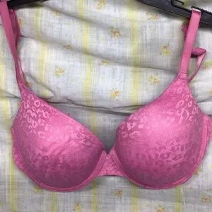 Chic pink bra with leopard pattern. Offers style and support. Ideal for daily wear.