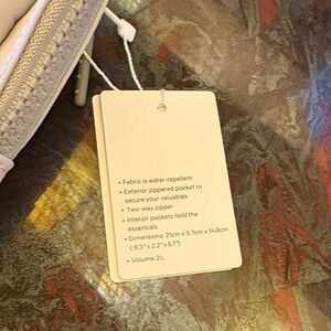 Stylish cream belt bag from Lululemon. Perfect for organizing essentials. It is very cute and compact. It has a lot of room in inside with the pockets. There is a zipper pocket on the back. It is brand new with the original packaging and has never been used or opened. It comes from a pet and smoke free home.