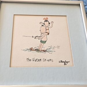 Vintage 1977 William Eagan Art Print "The Water Skiers" Signed Lithography, 1977. Drawing/illustration, Light blue matted, silver colored frame. Approx 7.25 in x 7.25 in. total, 4.25in. square print, 1.25 in. matted border.