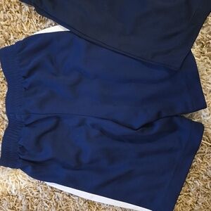 Nike athletic shorts both navy blue. One pair featuring white details with orange logo. The other pair featuring red logo. Ideal for active play.
