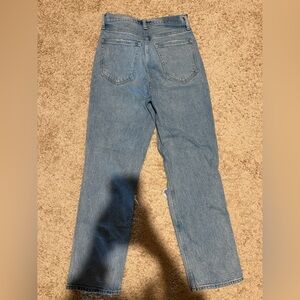 Trendy light blue jeans with stylish distressed details. Straight leg fit for a modern look. Size is 27/4 SHORT