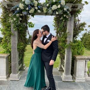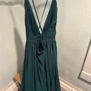 Chic backless design. Deep teal hue. Perfect for evening events.