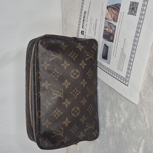 Vintage Louis Vuitton monogram pouch w/COA Unisex. Perfect for any occasion, this bag combines elegance and functionality and can be used for cosmetics, toiletries or everyday use. Had been professionally cleaned and conditioned inside and out. Has normal minor signs of wear and tarnishing on the hardware. Corners are great. Small tear near zipper about 1.5" shown in last pic... does not affect the proper use of the zipper.