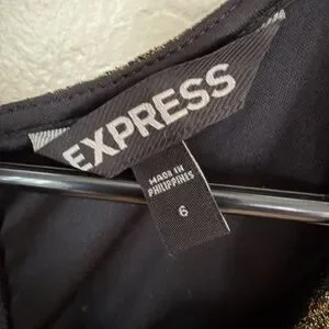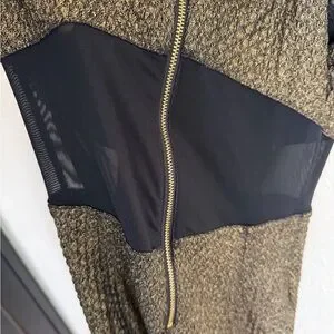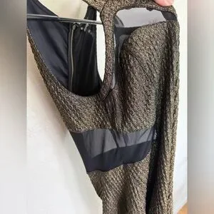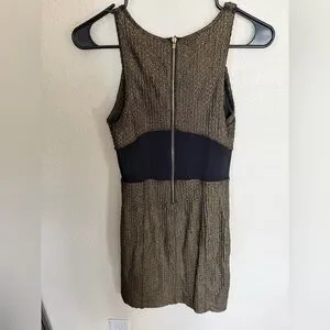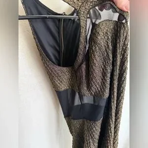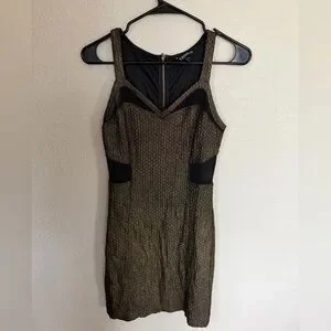 Chic mini dress with a shimmering gold pattern. Features black accents and a stylish design. Black material is sheer. Worn once and dry cleaned after. Great condition.