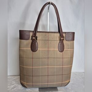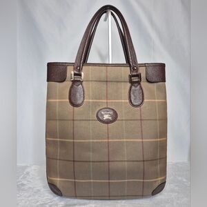 EUC Burberrys Vintage Olive & Brown Plaid Tote Bag. Features rich brown tones. CLEAN inside and out... with a minor water mark inside the pocket. ALL CORNERS & HANDLES ARE GOOD! Ideal for everyday and professional use. Minor scratches and tarnishing on hardware.