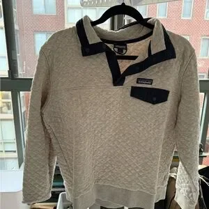 Quilted pullover with dark trim. Features button-up collar and chest pocket.