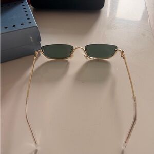 Elegant Gucci sunglasses with sleek gold frames. Dark green lenses for a sophisticated touch.