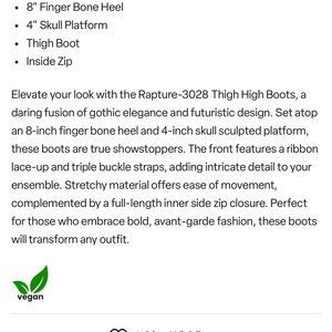 Elevate your look with the Rapture-3028 Thigh High Matte Black Boots, a daring fusion of gothic elegance and futuristic design. Set atop an 8-inch finger bone heel and 4-inch skull sculpted platform, these boots are true showstoppers. The front features a ribbon lace-up and triple buckle straps, adding intricate detail to your ensemble. Stretchy material offers ease of movement, complemented by a full-length inner side zip closure. Perfect for those who embrace bold, avant-garde fashion, these boots will transform any outfit.