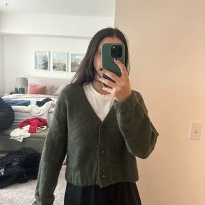 Cozy olive cardigan with button-up front. Alpaca & wool. Soft and versatile for any occasion.