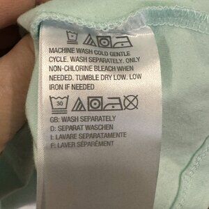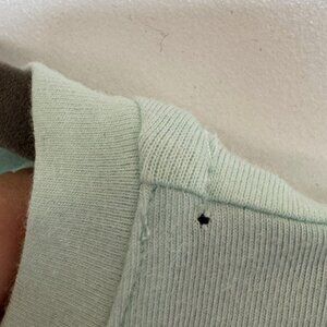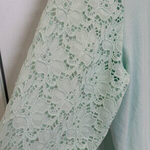 d&co. Denim & Company mint green knit scoop neck top with lace sleeves, women’s size Large, in good used condition. Soft cotton‑blend body with 3/4 length floral lace sleeves for a pretty, feminine look that dresses up jeans, shorts, or skirts. There is a small pin‑sized hole at the left shoulder, likely from a tag (see close‑up photos), but otherwise the top shows no other wear. Approximate measurements: 22 in. armpit to armpit; 25 in. length. Please ask all questions prior to purchase.