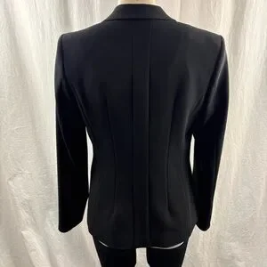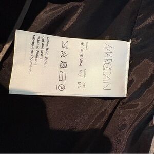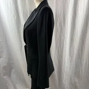 The Chic MarcCain Blazer with Silk Lapels in size Number 3 which is equivalent to US 8. It is a stylish and elegant addition to any woman's wardrobe. It has a little pocket inside for a credit card our so.Perfect for weddings and for a special occasion This deep black blazer exudes sophistication and classThe blazer features a classic black colour and a sleek design, making it perfect for special occasions and diner parties . With its high-quality construction and timeless style, this MarcCain blazer is sure to become a versatile and essential piece for that special moment in your closet.