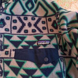 Stylish sweatshirt with geometric patterns. Features blue and green colors. Perfect for casual wear.