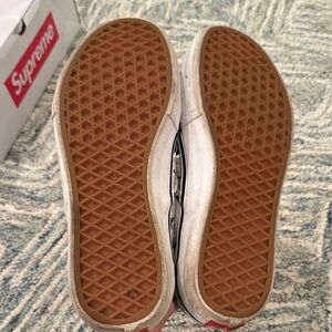Stylish Supreme slip-on sneakers. Features a black geometric pattern on white. Comfortable and easy to wear.