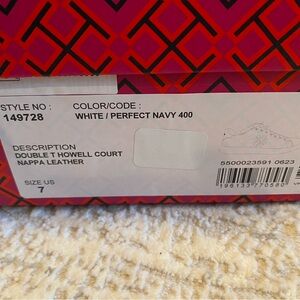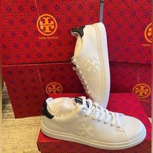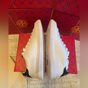 Elevate your look with these sleek Tory Burch sneakers. White leather with Navy accents. Ideal for casual wear.