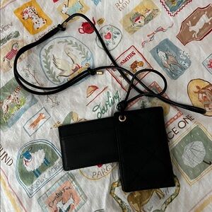 Elegant black quilted card holder with iconic gold logo. Compact and stylish.