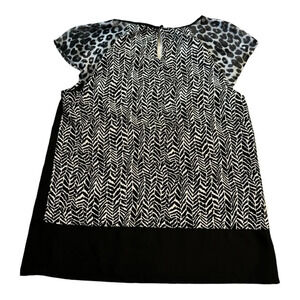 Black and white chevron-like print on the majority, black and gray animal print on the cap sleeves, and a plain black vertical panel on the left size, black lining at the scoop neck, and a cute little keyhole in the back with a small black button.