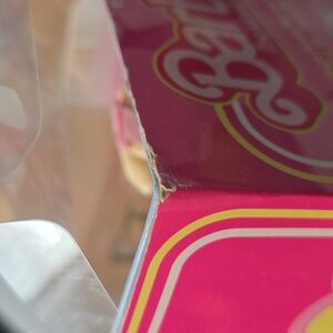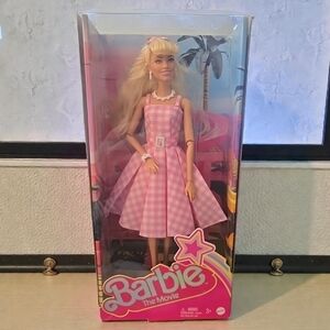 Barbie The Movie doll wearing a pink checkered dress. Perfect for collectors and fans.