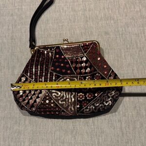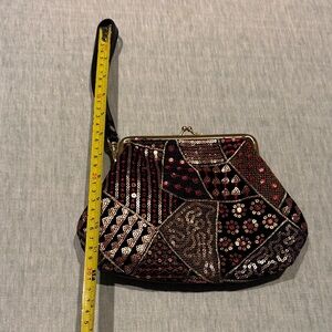 Chic patchwork design. Black and red tones. Secure clasp closure. Ideal for any occasion.