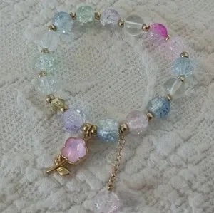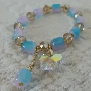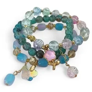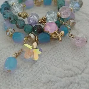 Sparkling Teal Beaded Charm Bracelet Set Blue Pink Flower Butterfly Cute Fairy