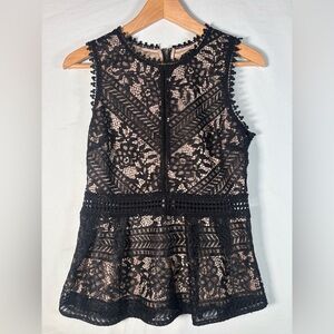 Elegant Romeo + Juliet Couture sleeveless lace top featuring an intricate black lace overlay with a soft nude lining. Designed with a flattering peplum hem, geometric lace detailing, and an exposed back zipper for a sleek, tailored fit. Feminine, romantic, and perfect for evenings out or dressed-up occasions.