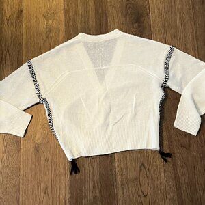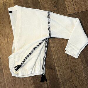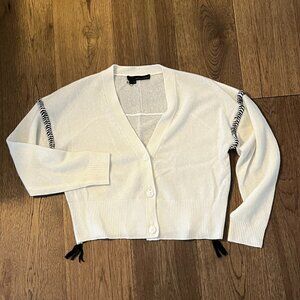 Deep v-neck button front cardigan has black/cream braided trim around armholes and down sides, ending in tassels.
