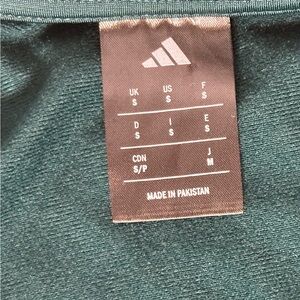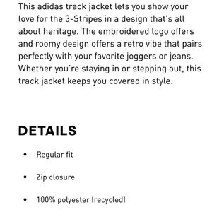 Sleek teal jacket with white accents. Ideal for sports or casual wear. Features classic Adidas stripes. This is a technically a men’s jacket but is very much UNISEX. I wear a medium in women’s and this jacket fits me great, and is very complementary to my figure.